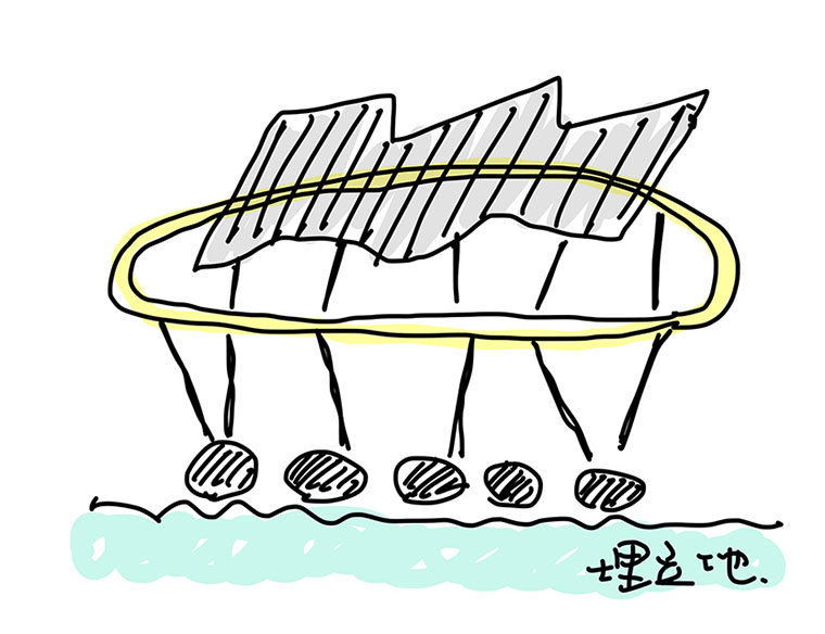 《サテライトスタジオ(西)》の初期スケッチ。埋立地である万博会場に対して、どのような接地がありうるかの検討。