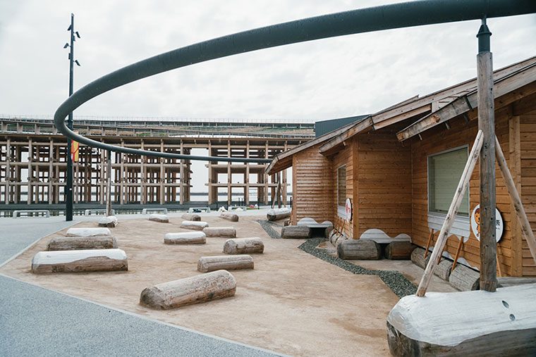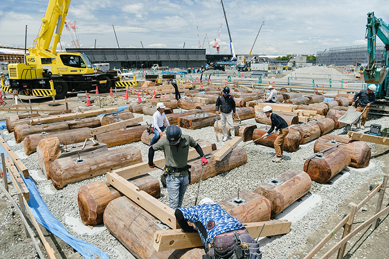 たった半年の期間の開催である万博会場のほとんどの建物が法律上は仮設建築物として作られている。仮設建築物と言っても、構造の性能要件は普通の建物とほぼ変わらないので、しっかりと土地に定着した基礎が必要となる。設計に取り組む際、短期間しか建たない万博という敷地条件と、建物に必要な基礎の定着性とのギャップがどうしても気になり続けた。さらには土地への一時的な定着のために環境コストの高いコンクリートを基礎として使うことへの違和感も感じていた。そこで設計した施設「サテライトスタジオ(西)」では、基礎をコンクリートではなく、木製の丸太をイカダのように土地の上にゴロンと転がし並べ、丸太の上に建物を載せるという形式を考えた。さらには建物自体を半年間で解体して捨ててしまうのではなく、万博会期後には、基礎の丸太ごと別の場所へ移築させることを予定している。初めに述べた日本とインドの間の移動から組み立てた住宅のプロジェクトと同じように、今回も移動というモチーフをあらかじめ据えることで「地に足をつけない建築」を構想したのだった。