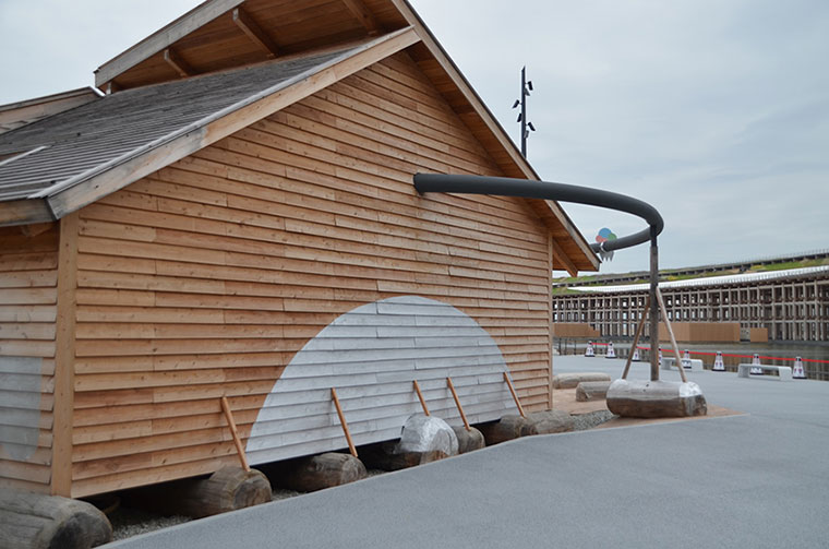 移築先は福島県内を予定している。基礎となる丸太や上部木造の木材は結果的に福島県産のものを使っているので、その建築は福島で集められた部品を、大阪の万博会場で「仮組み」と「仮置き」をし、また福島へと持って帰って移築するという往復の軌跡を描くことになる。福島に移築する際にはもちろん周囲の環境も用途も変わるので、壁で閉じていた部分は開け放ち、周囲には新たな要素を付加するなどして、移動とともに、あるいは移築後もその姿自体が変転し続けるような建築を目指している。そして変転を続ける建築の有り様を通じて、これからの曖昧な社会を思考し続けたいと思う。