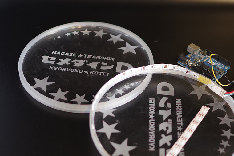 2台目のフロートは推しの名前をどどんっ!と光らせます。アクリル板をレーザー彫刻して文字部分を磨りガラスのような状態に。円の縁にカラーLEDがたくさんついたテープをはりつけて文字を側面から照らすようにします。彫刻した部分だけが光を拡散させ輝いて見えるはず。ArduinoでLEDを制御して、セメダインDをイメージした白と青が交互に切り替わるように光らせます(光る様子は完成のところで!)。