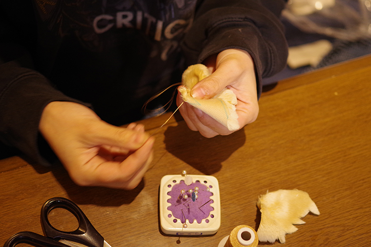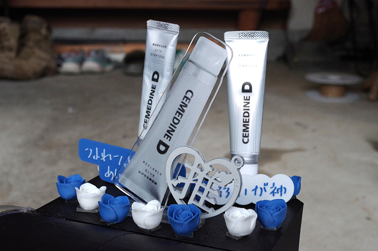 いよいよ、グッズやご神体(接着剤本体)を飾りつけていきます。イメージとしては動く祭壇。アクリルスタンドを乗せ、缶バッジを貼り付け、ぬいを乗せ。日頃の感謝と、「今後の工作もうまくいきますように」という祈りをこめて配置していきます。