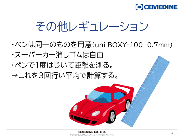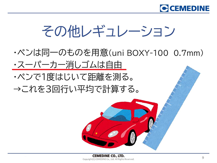 そして最後がレースです。ノック式ボールペンで後ろから弾いて、先にゴールした方が勝ち!以上の3つの種目で争ってください!ちなみにレギュレーションはこんな感じです。