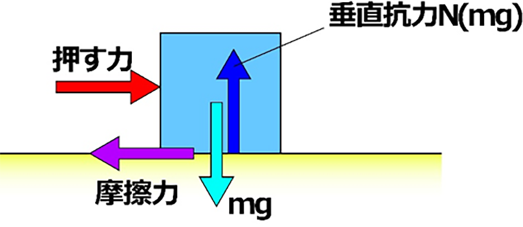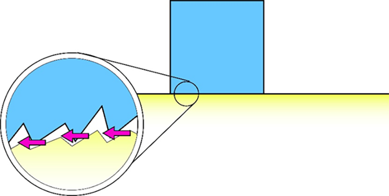 図からもわかる通り、押す力に対して逆向きにかかるのが摩擦力だ。ではなぜ、このような力が生じるのか、それには物体と床面の接触面で何が起こっているのかをミクロの世界で知る必要がある。