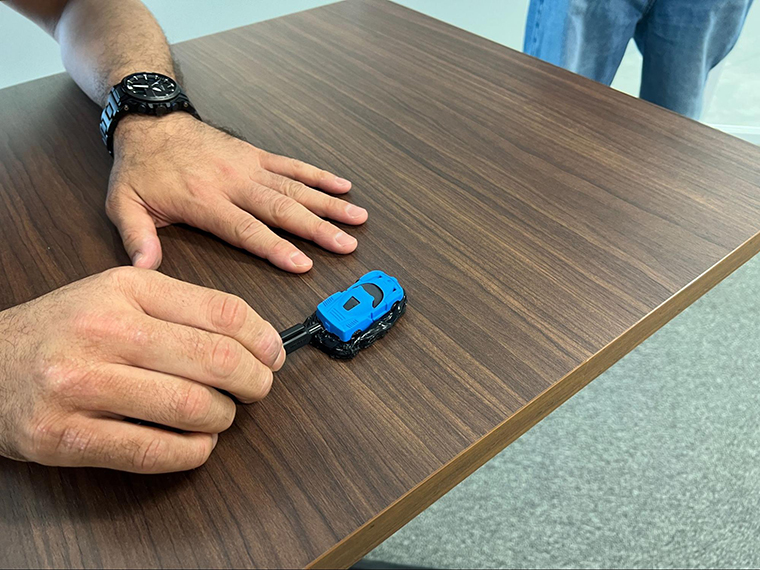 ひとつめはシンプルに、ノック式のボールペンで弾いてより遠くに進んだほうが勝ち、というゲームです。より摩擦係数を下げられる接着剤を見つけられるかどうか、がカギになります!