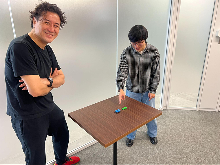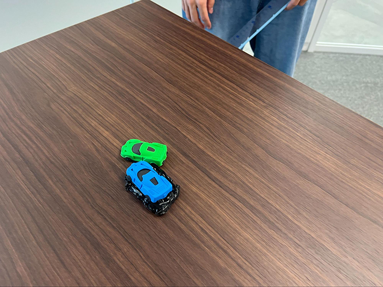 2つめはスーパーカー消しゴム相撲です。スーパーカー消しゴムを定規で弾いて相手の車にぶつけ、相手を押し出したほうが勝ち!こちらはむしろ、摩擦係数をあげてグリップ力を強くした方が有利かもしれません。