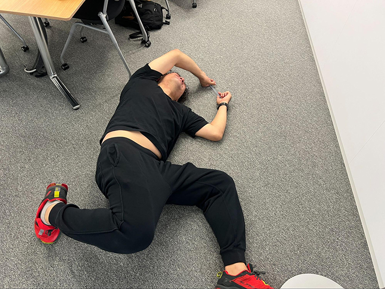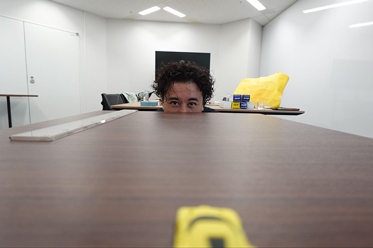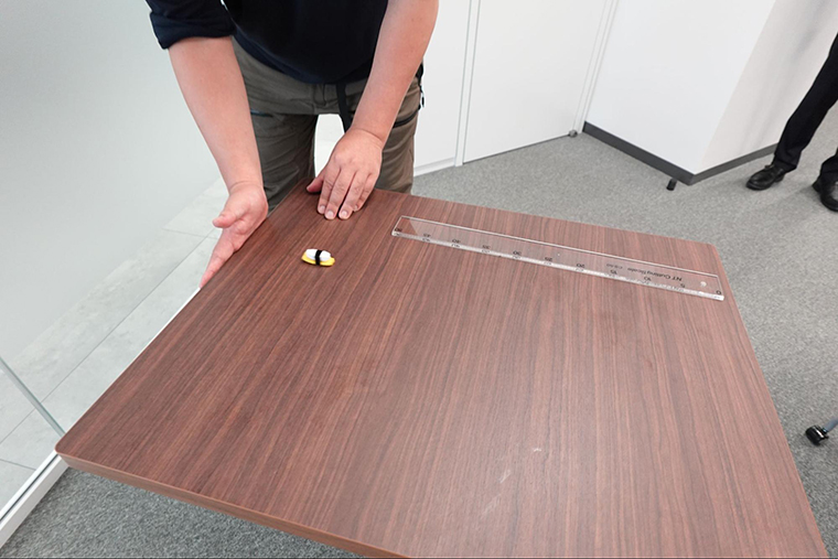 わかります?こうやって、手のひらで叩いて逆側の机の端ギリギリまで寄った人の勝ち。