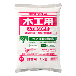 | 容量/規格 | 50mL/ポリ容器 | 50mL/フック用袋入り | 180mL/ポリ容器 | 500g/ポリ容器 | 750g/ポリ容器 | 1kg/ポリ缶 | 3kg/ポリ缶 | 1kg/スタンドパック | 木工用605Ⅱ 3kg/袋 |